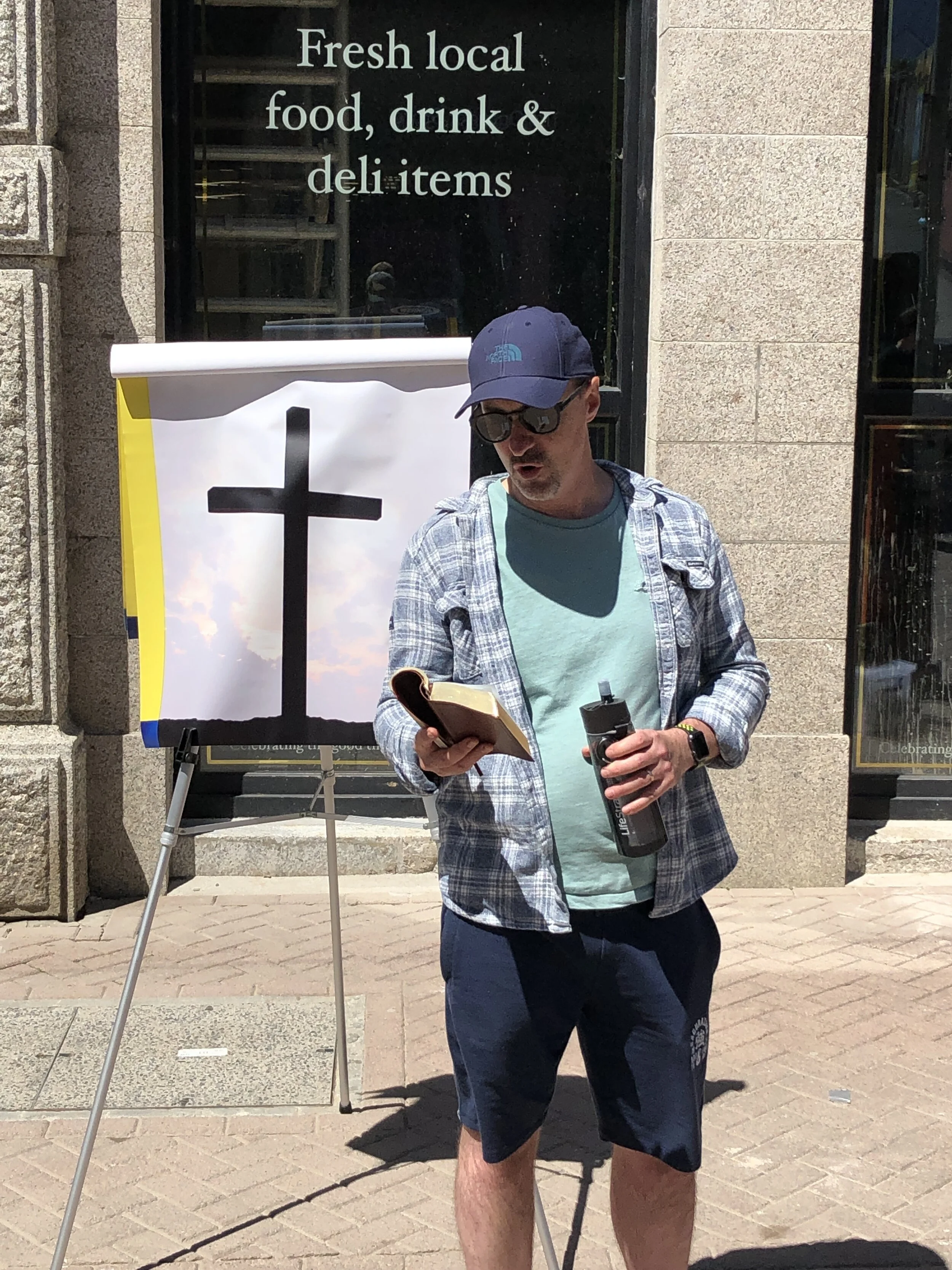 After spending more time handing out tracts, I decided to close out the outreach by preaching one more time. This time I spoke briefly from 1 John 4:10 – “In this is love, not that we loved God, but that He loved us and sent His Son to be the propitiation for our sins.” From this verse, I spoke about God being the loving Creator and the fact that we don’t love God. After stressing the nature of our sin, I went to how God shows His love in the giving of Jesus on the cross. As the last preacher of the day, I called on those listening to trust in Christ and to visit us at Newquay Baptist Church if they have any further questions.