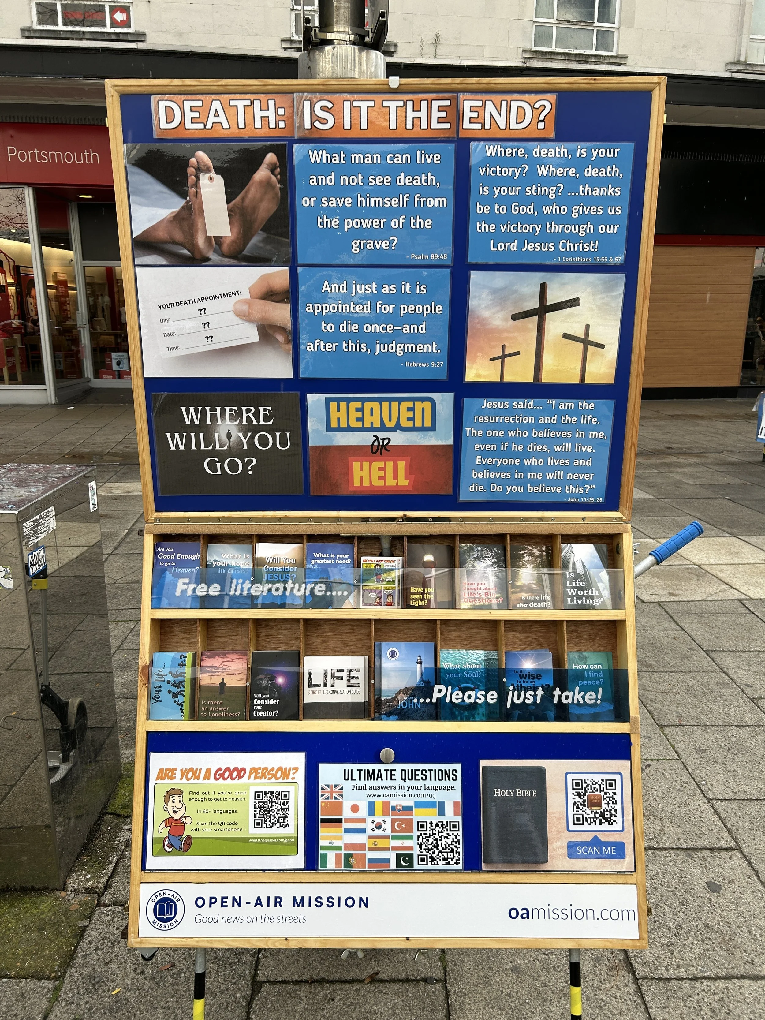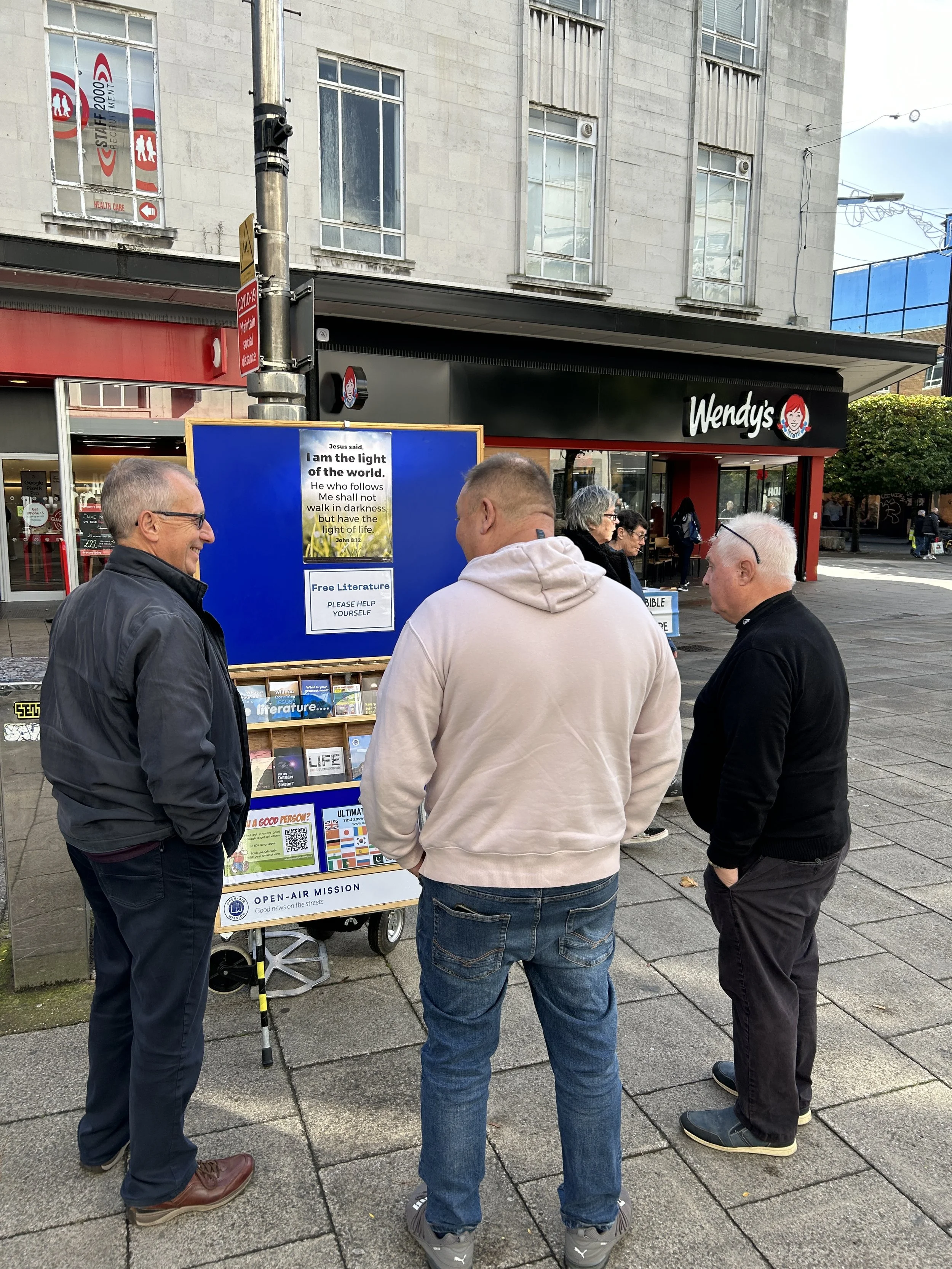 Some outreaches begin slow and take time to get going – Portsmouth wasn’t like that today. As soon as we began, people started to engage us in gospel conversation. One man walked by the open-air board, seeing the sign mentioning ‘free literature.’ He commented, “Nothing is free!” From that one statement, a gospel conversation ensued.