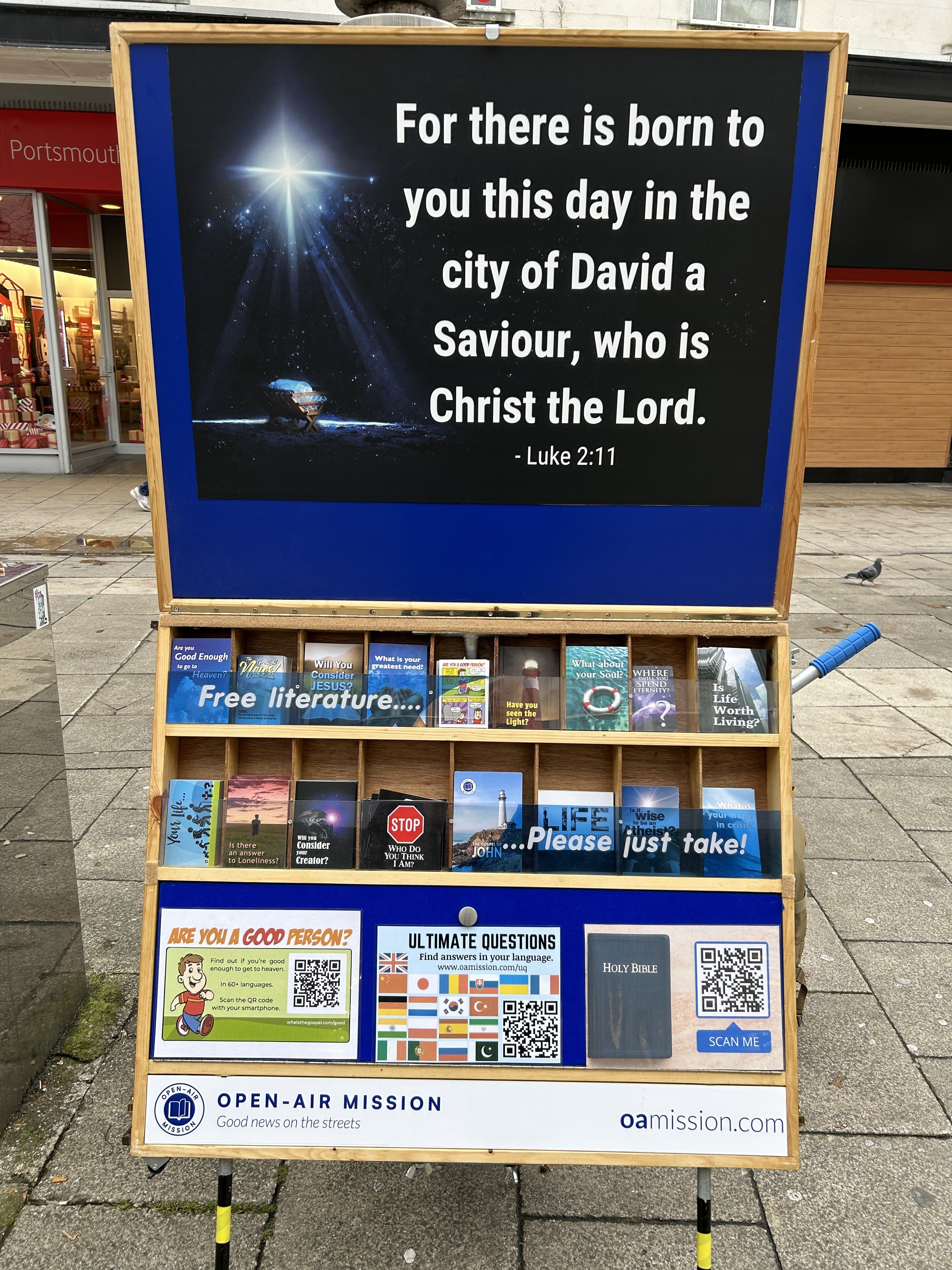 We were able to test out a new Scripture sign that we have produced for the open-air board. Over the past few weeks, I have noticed that many people read the board while we are handing out tracts. Usually, we have a little Scripture poster on it, but that isn’t always the easiest to see. So, after talking with a Christian printer friend of mine, we decided to make a large Scripture poster. The aim is each month (if we can afford it), we will change posters. This will expose people to a different portion of God’s Word monthly. For December, the poster is Luke 2:11 – which fits nicely with the Christmas season.
