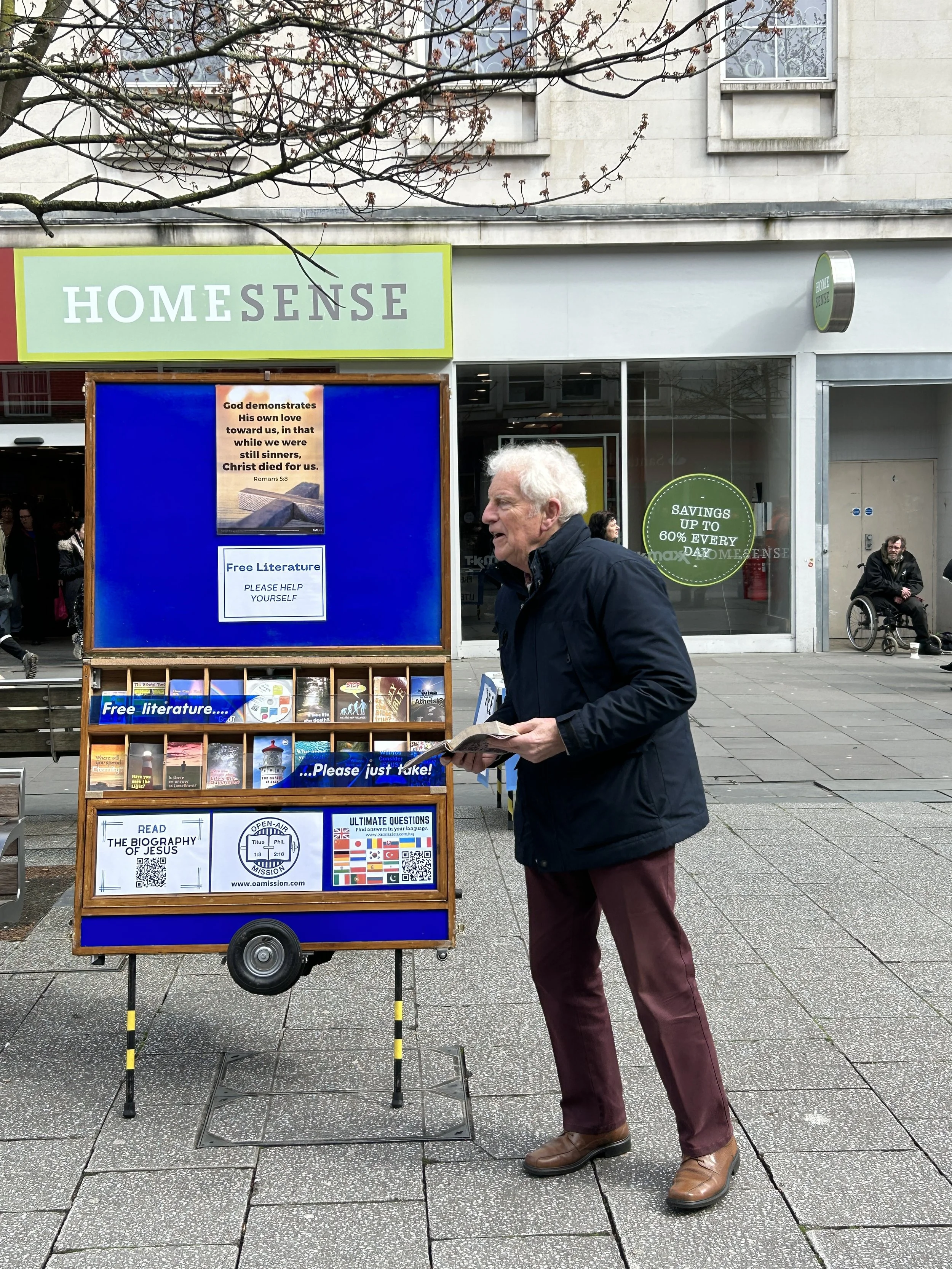 We arrived at Southampton at 1pm and began the process of setting up the Free Literature table, and the open-air board. Nearly instantly after setting up the table, a man came over to ask for literature. Last week, this same man, took a booklet, this week he came back for more. He told me that he had read what he was given, and now he wanted to read more about Christ. He took a copy of John’s Gospel and a couple of other booklets.