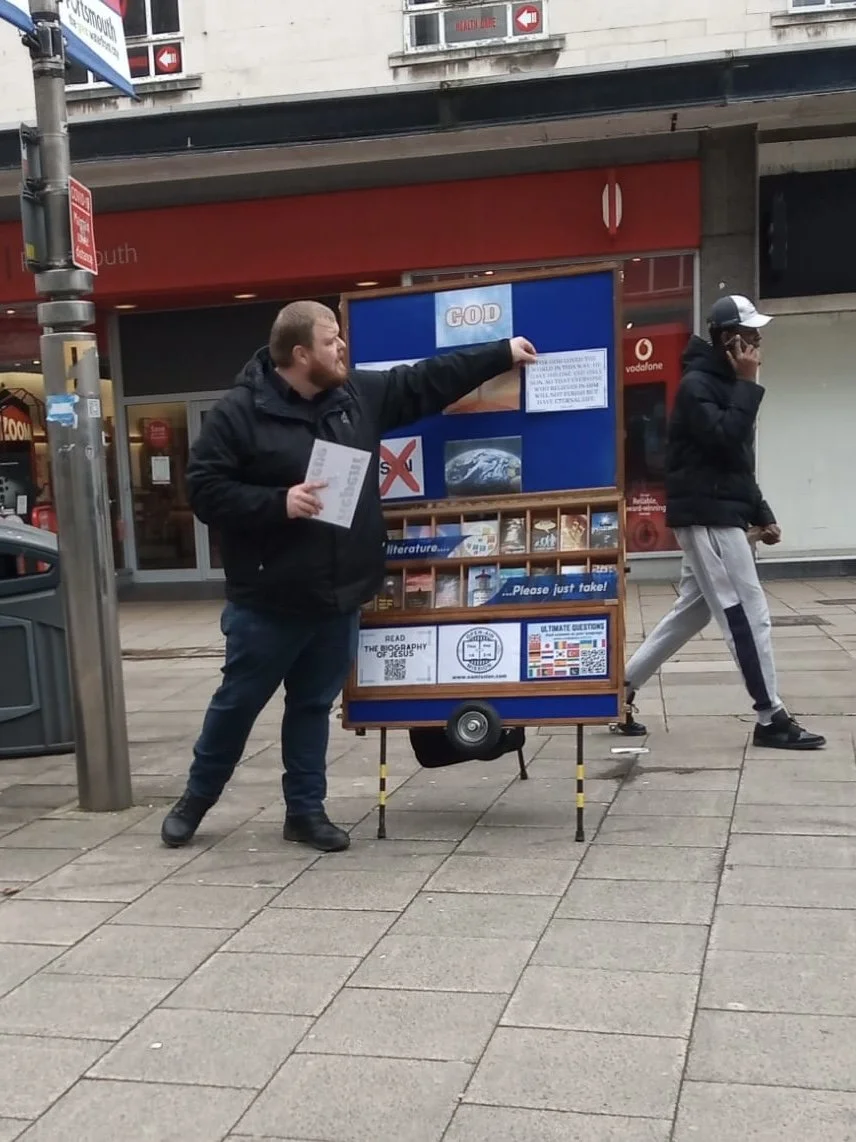 One of the challenges we faced today was a busker that set up right behind where we were preaching. But, these kinds of difficulties are common on the street, so we cracked on with the outreach and didn’t give him too much thought. I was the first preacher for the day, so I began by testing out a new message. Today, I spoke about “God’s Love for the World.” In this message, I seek to show that God is the Creator, but our sin has separated us from Him. I then swing to the gospel to show that Jesus is the only way we can be forgiven.