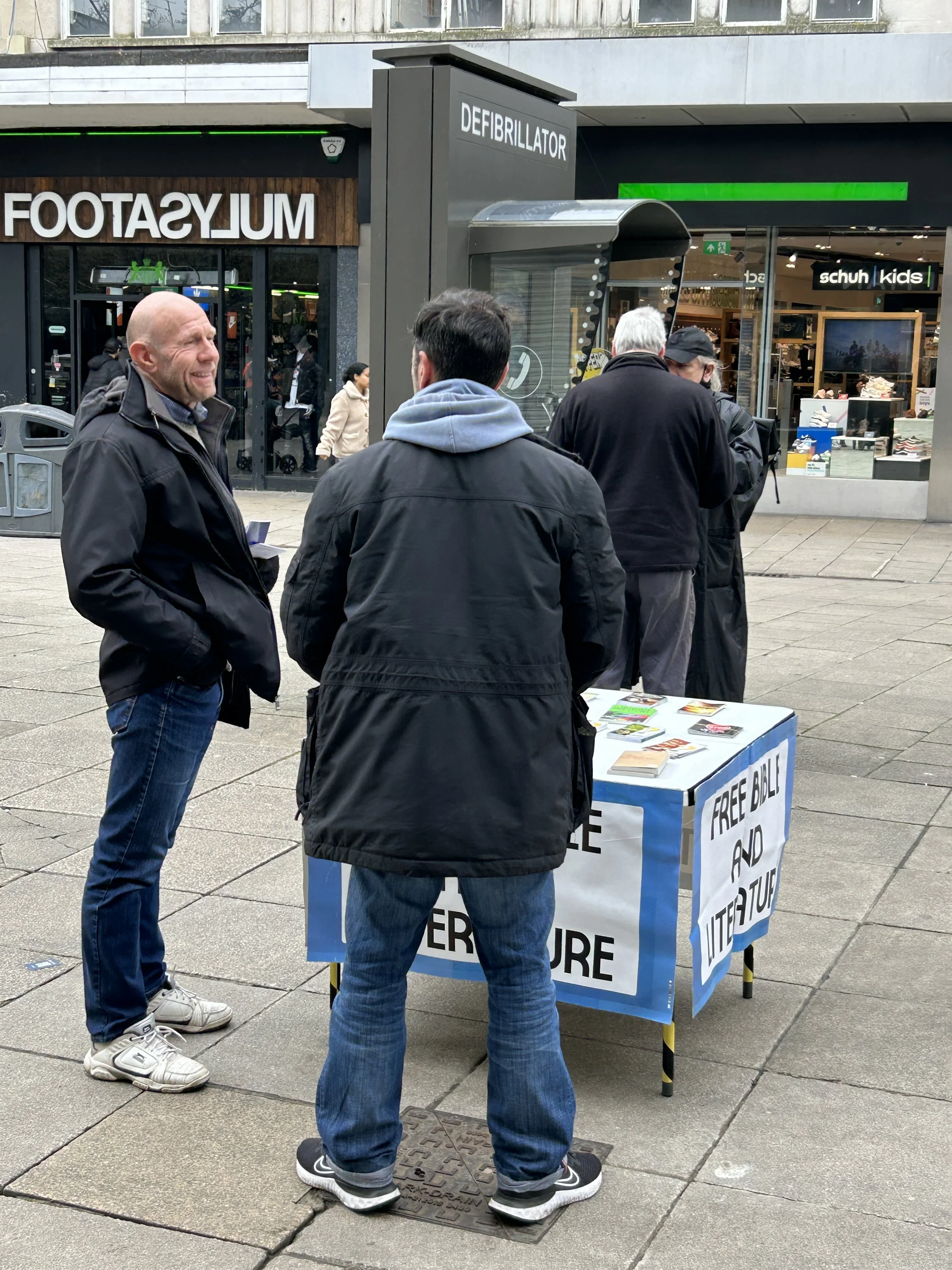 When I finished preaching, Roger began to speak. His message addressed the common thought that people have, namely, that they are good enough to go to Heaven. While he was preaching, a man stopped to chat with me. His girlfriend didn’t want him to stop, but he told her to go away, and he began to speak. He was a young Muslim man from Uzbekistan, and he was very interested in discovering more about Christianity. I shared with him about the gospel, and then I took him over to the Free Bible table. There I was able to give him a card that allowed him to read the booklet, “Ultimate Questions” in multiple languages, and I also gave him a copy of John’s Gospel. As he held the Gospel of John he said, “I’ve never heard anything about Jesus.” This man has lived in the UK for several years, yet sadly, no one had ever bothered to tell him about the Saviour. He took many booklets and promised to read them all. Please pray for him.