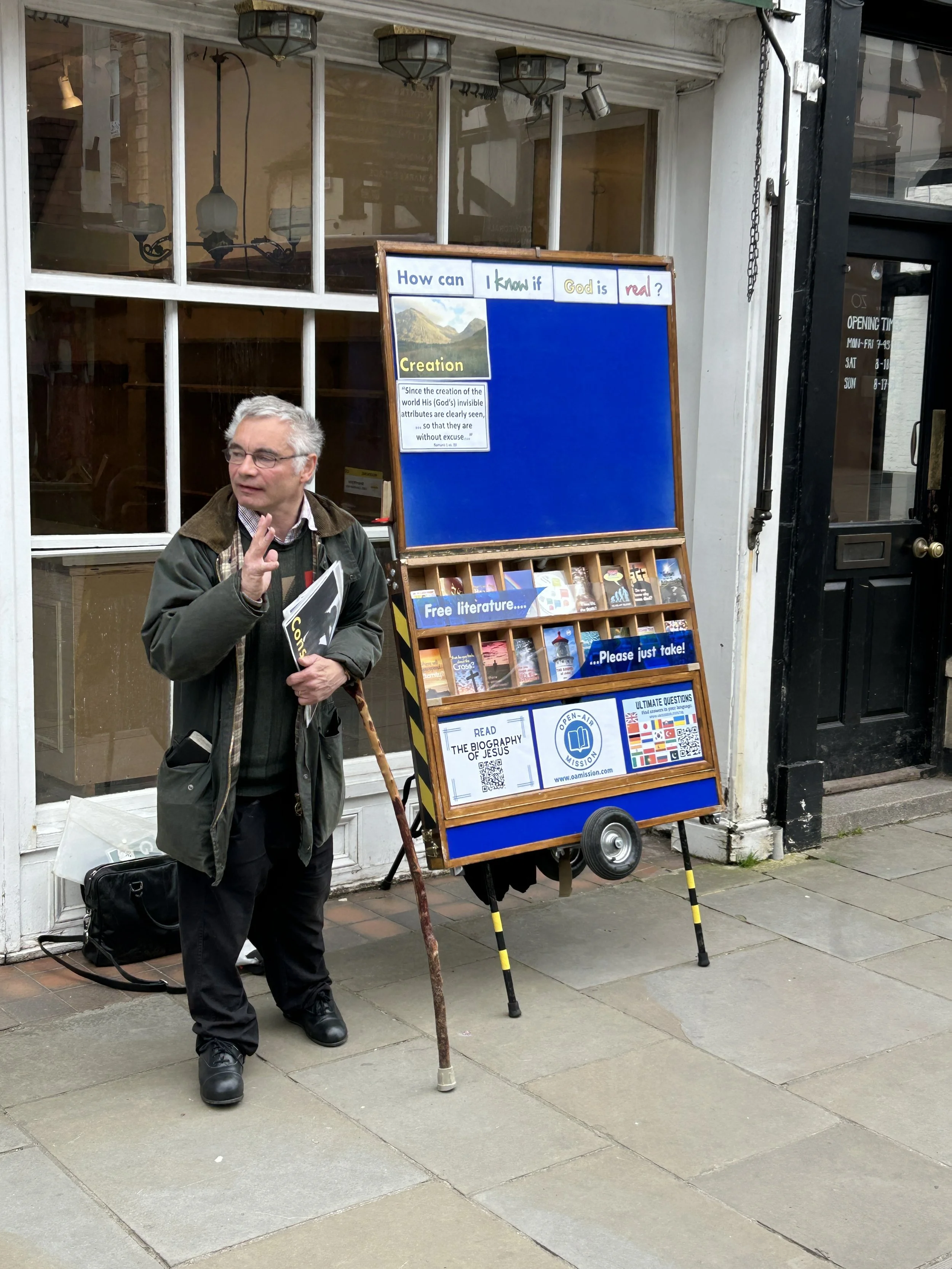 Paul preached next. As he preached, some light rain began to fall, but that didn’t bother the people in the high street. Some listened as they walked by, and others took tracts from one of the team members.