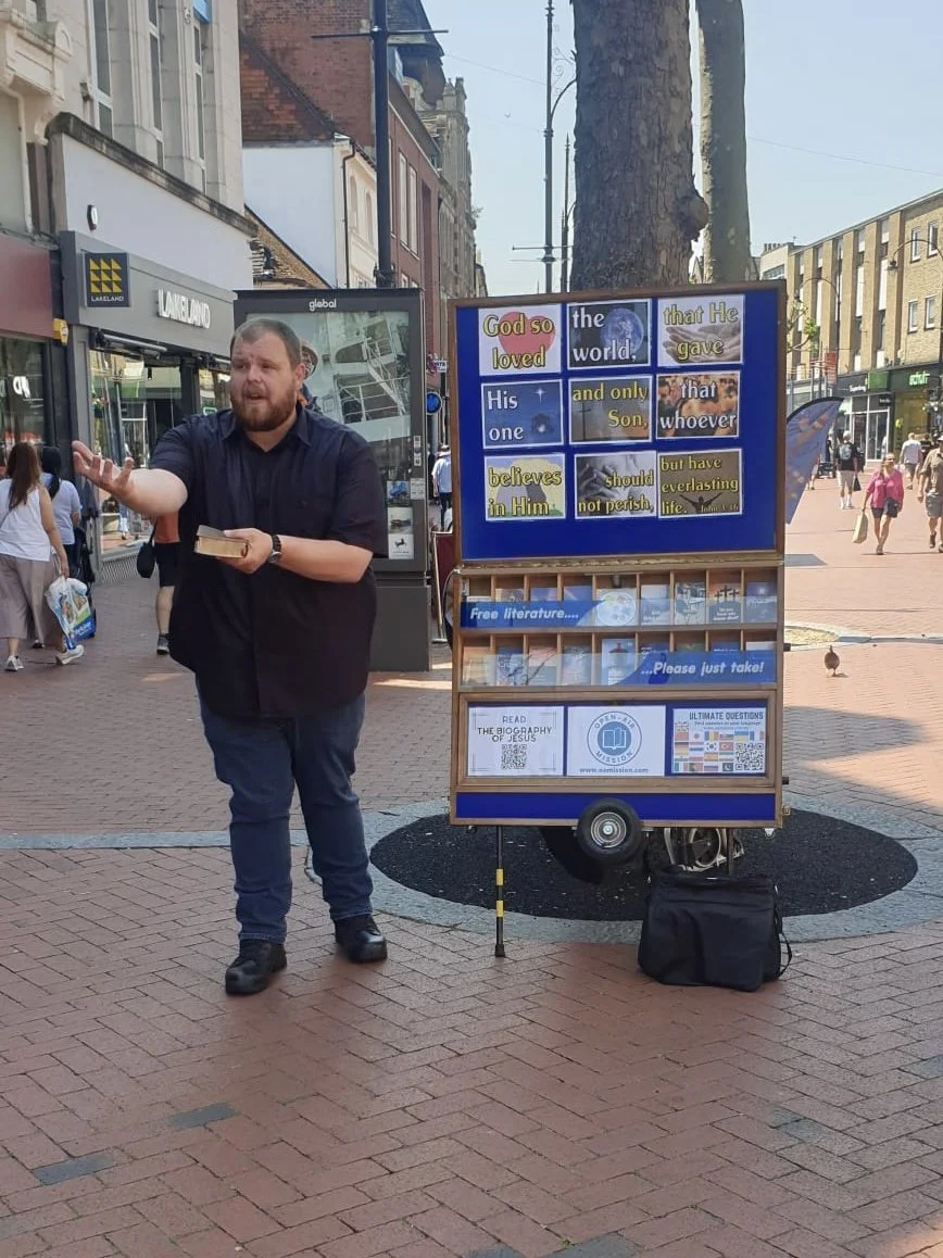 Then, my second heckler arrived on the scene. This young man was a Muslim, who wanted to pull down the biblical teaching of Jesus and the authority of the Scripture. His argument was that Jesus was not divine, and he also wanted to know where the body of Christ was located. I engaged him in apologetics while explaining the gospel. But this young man wasn’t interested in listening. Whenever I referenced my Bible, he would say, “NO! That is a new Bible, you can only use the old Bible.” I asked him to clarify what he meant, but he couldn’t explain, all he could say was that the old Bible was in France somewhere. I pointed out the Scripture hasn’t changed, but he wouldn’t believe it. His ranting did bring a few people along to listen, including a Muslim man who filmed everything. Eventually, I passed the heckler on to Rich (sorry mate!) so that I could preach to those listening. I explained the gospel once again and offered a copy of John’s Gospel to anyone who wanted more information. Two men, including the Muslim man who was filming, asked for a copy.