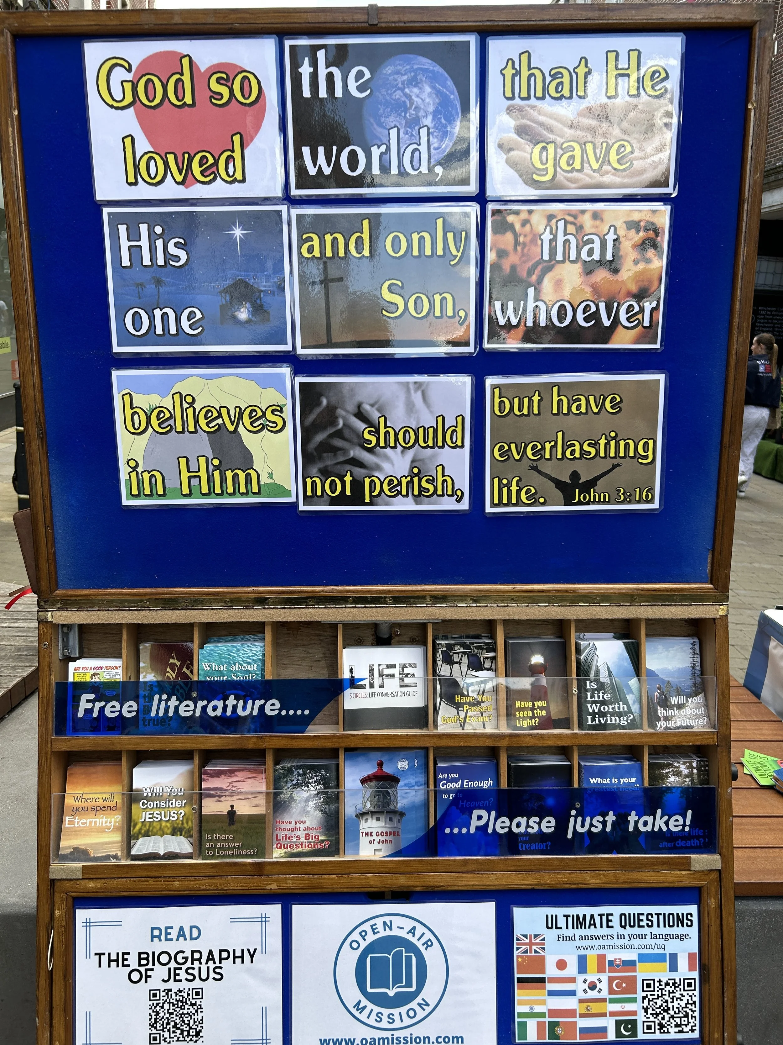 At around 12:30pm, I decided to preach. My message for the day was on God’s love as found in John 3:16. A few people stopped to listen; unfortunately, a well-meaning lady interrupted the listeners, as she wanted to talk to them about healing, signs, and wonders. I spoke to this lady afterwards, and even though she knew the gospel, her focus was on the miraculous. I gently encouraged her towards a biblical approach, but she only wanted to focus on the power. Sadly, her actions stopped some from hearing the good news.