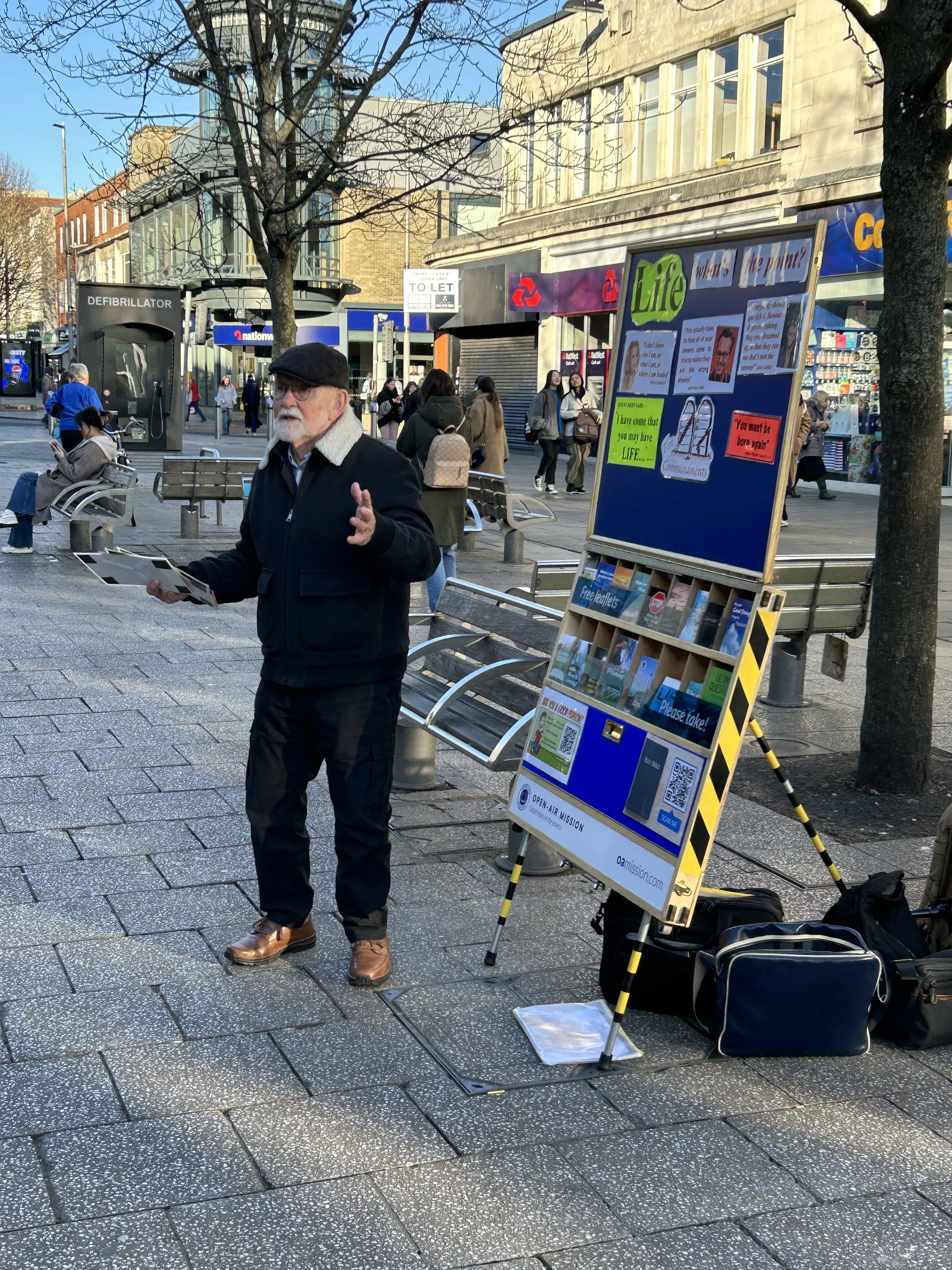 It was a cold but beautifully clear day in Southampton. Despite the nice weather, the city centre was quieter than usual. While setting up, people stopped at the open-air board to take literature. At first, it was a Christian who was greatly encouraged by the work, and then non-Christians came by to take tracts. The opposition came sneaking in – a false gospel appeared in our midst.