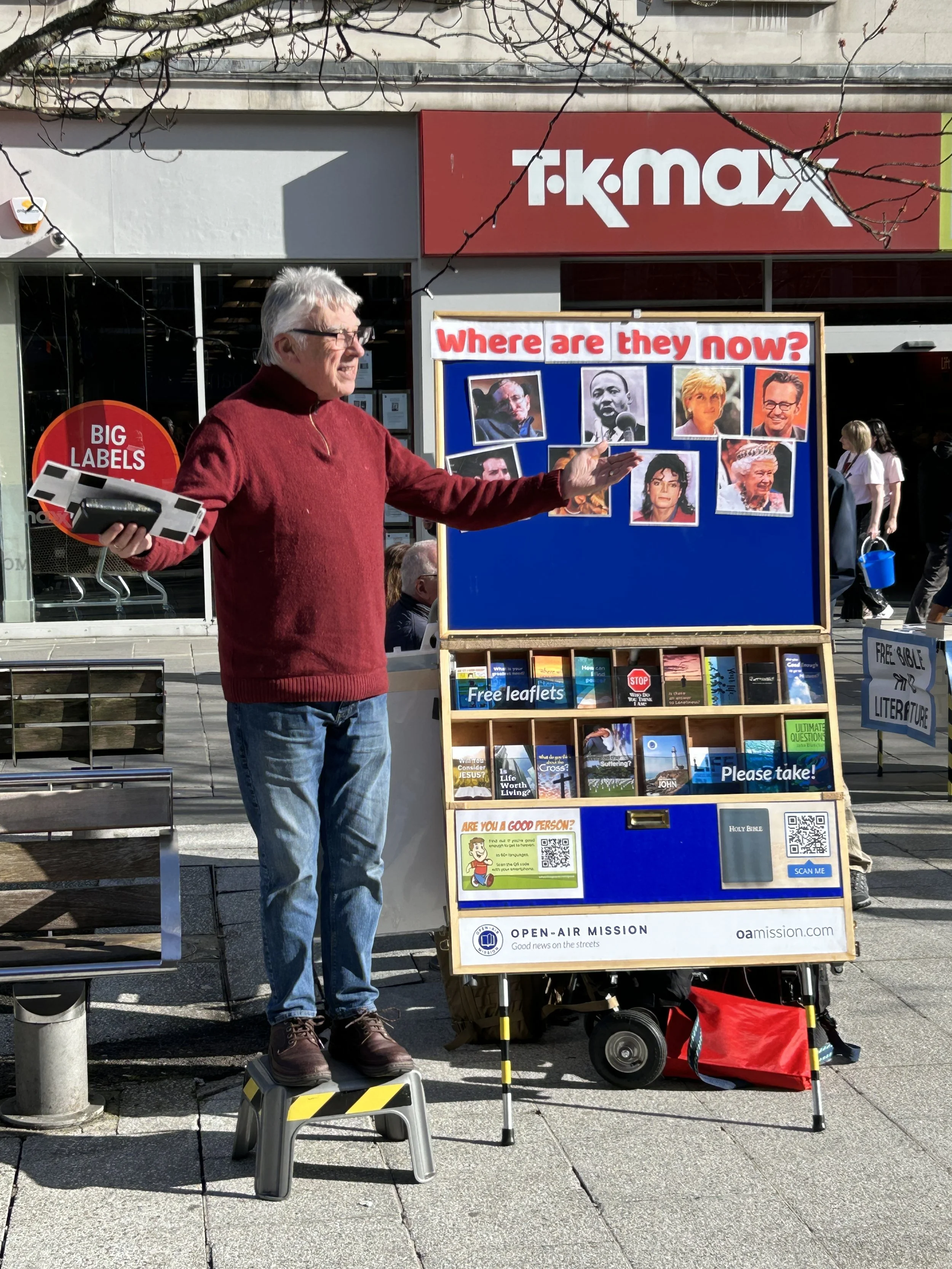 Mike Mellor commenced the preaching by speaking on “Where Are They Now?” Using photos of famous people who have died, he challenged listeners to consider eternity. At the end of his talk, two people responded by taking John’s Gospels.