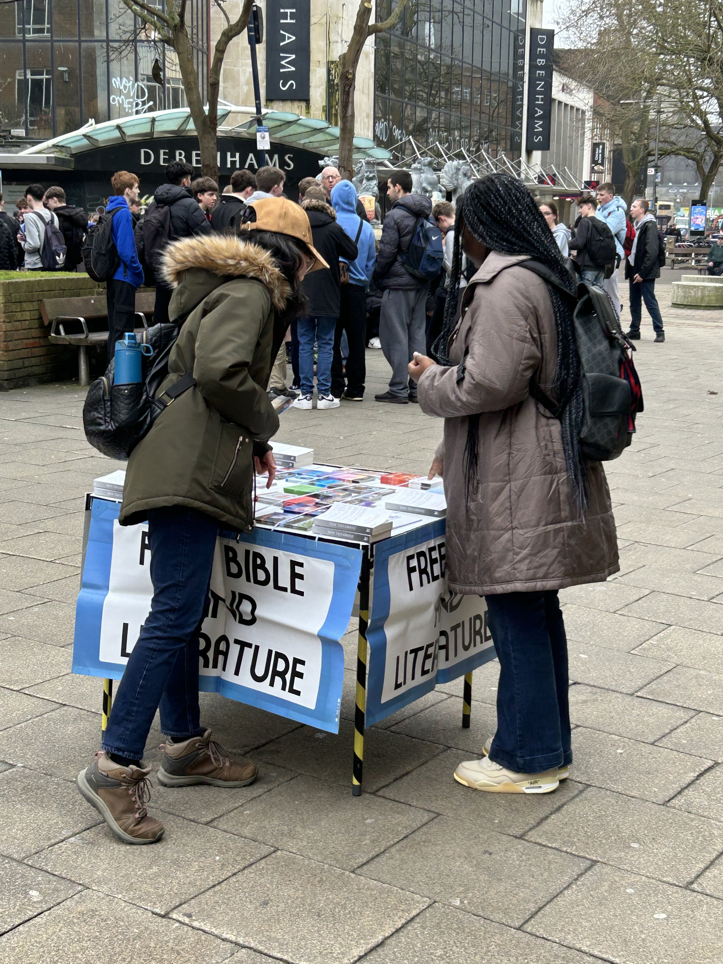 We set up the free Bible table in a different location to see if it’d be more effective; immediately, we saw people coming up to browse the literature and take the material. We then saw a large group of older school kids come by – all took tracts. It was wonderful to see many reading the leaflets as they walked on.