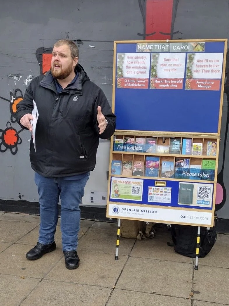 It was then my turn to preach. I decided to stick with the Christmas theme by speaking on the subject of “Name That Carol”. Using lyrics from three different carols, I showed that we sing about the gospel and our need of Jesus. It was a challenging open-air, as shortly after I started it began to rain. Then the breeze seemed to pick up. On top of that, a busker was playing ‘Jingle Bells’ loudly nearby. To make it even more challenging, a group of young schoolchildren on an outing walked by; they were all excited by the busker, so they too were singing ‘Jingle Bells’ loudly. At this point, I paused and waited for all the children to pass. When I did get back to preaching, a couple of people listened, including one man who took a Gospel of John.