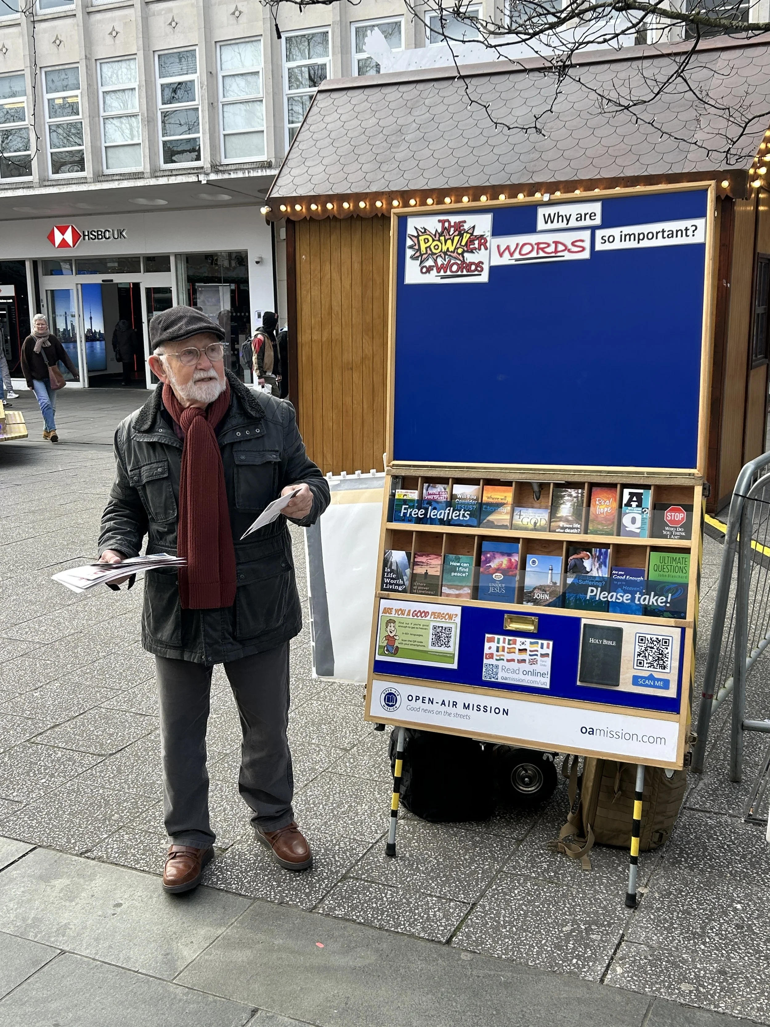 The half-term school break has started, which means the city centre of Southampton has been transformed into a carnival with rides, markets, and stilt walkers. This meant our usual open-air location was unavailable, but thankfully, there was a spot nearby where we could set up. While setting up the literature table, two young ladies saw the sign saying, “Free Bibles and Literature,” so they called Jeremy over to chat. He was able to share the good news with them. The outreach was off to a busy start!