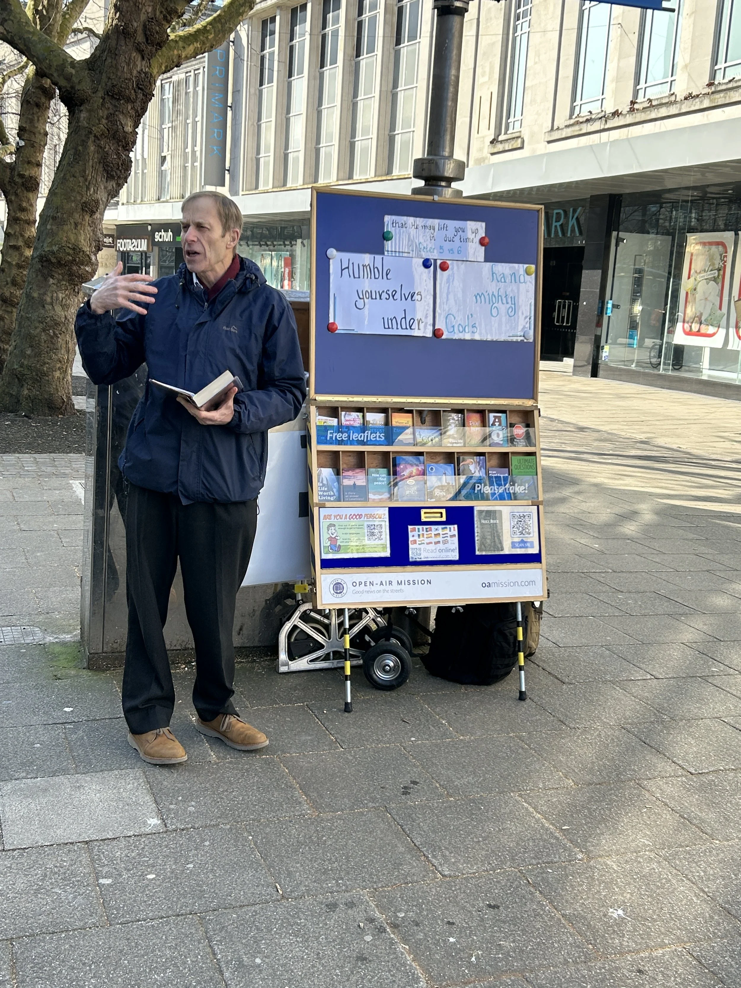 After Chris, I preached. I took John 3:16 as my text and spoke about ‘Good News for Portsmouth’. A young couple both took copies of John’s Gospel at the end, but there was also another man listening. He has heard me preach several times; he is a Muslim who listens but refuses to take material. Today, however, he took both a tract and a New Testament.