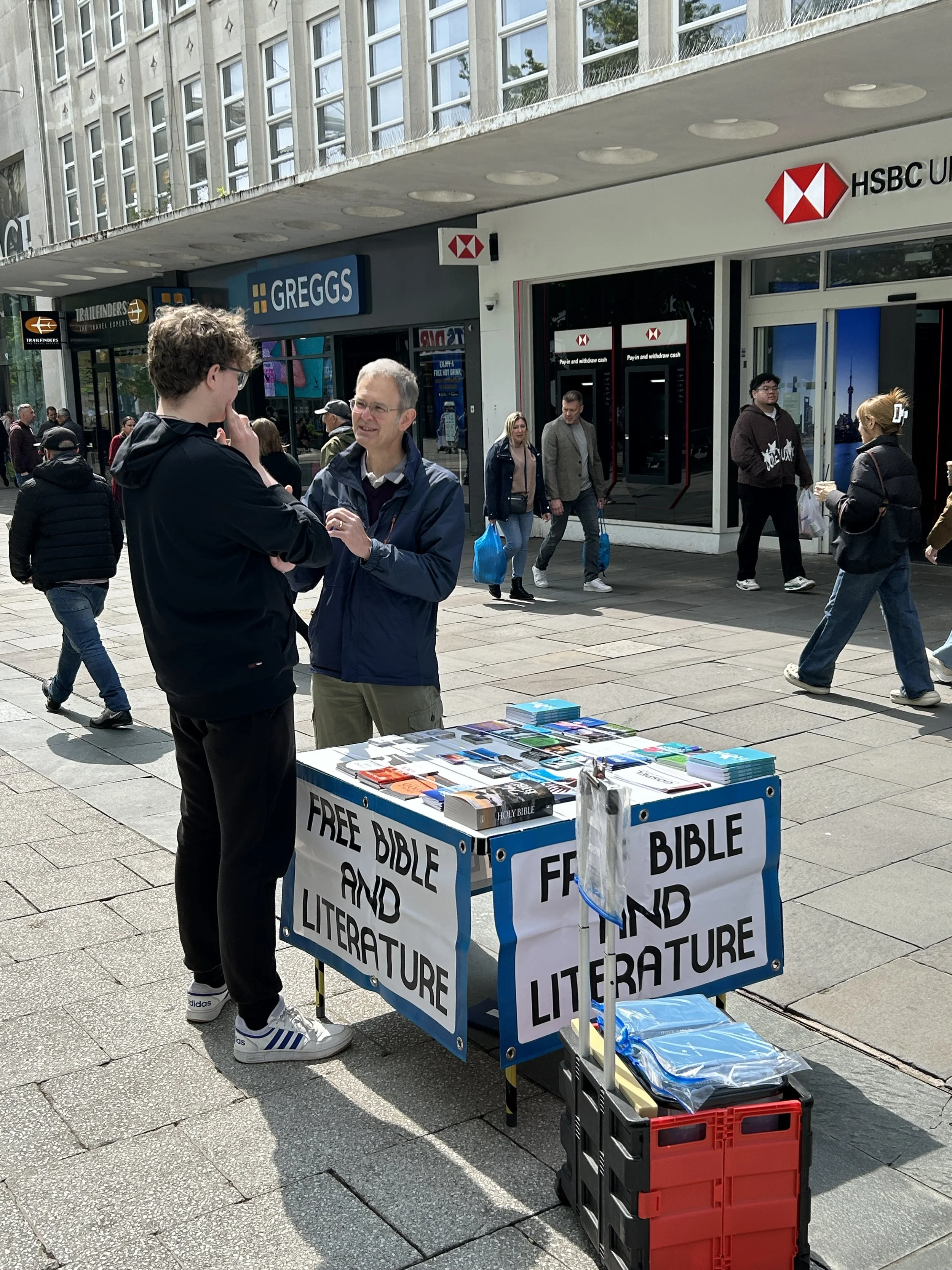 Over at the table, Jeremy was deep in conversation with a young Scottish man who was down visiting his girlfriend, who is studying in the area. The man isn’t a Christian, but he had questions. Jeremy answered them and explained the gospel. After hearing the message of Jesus, Jeremy asked the Scotsman when he would trust in Jesus. The man replied, “As soon as possible!” Then, in the middle of busy Southampton, the man bowed his head and prayed. It is always encouraging to see people asking Christ to forgive them!