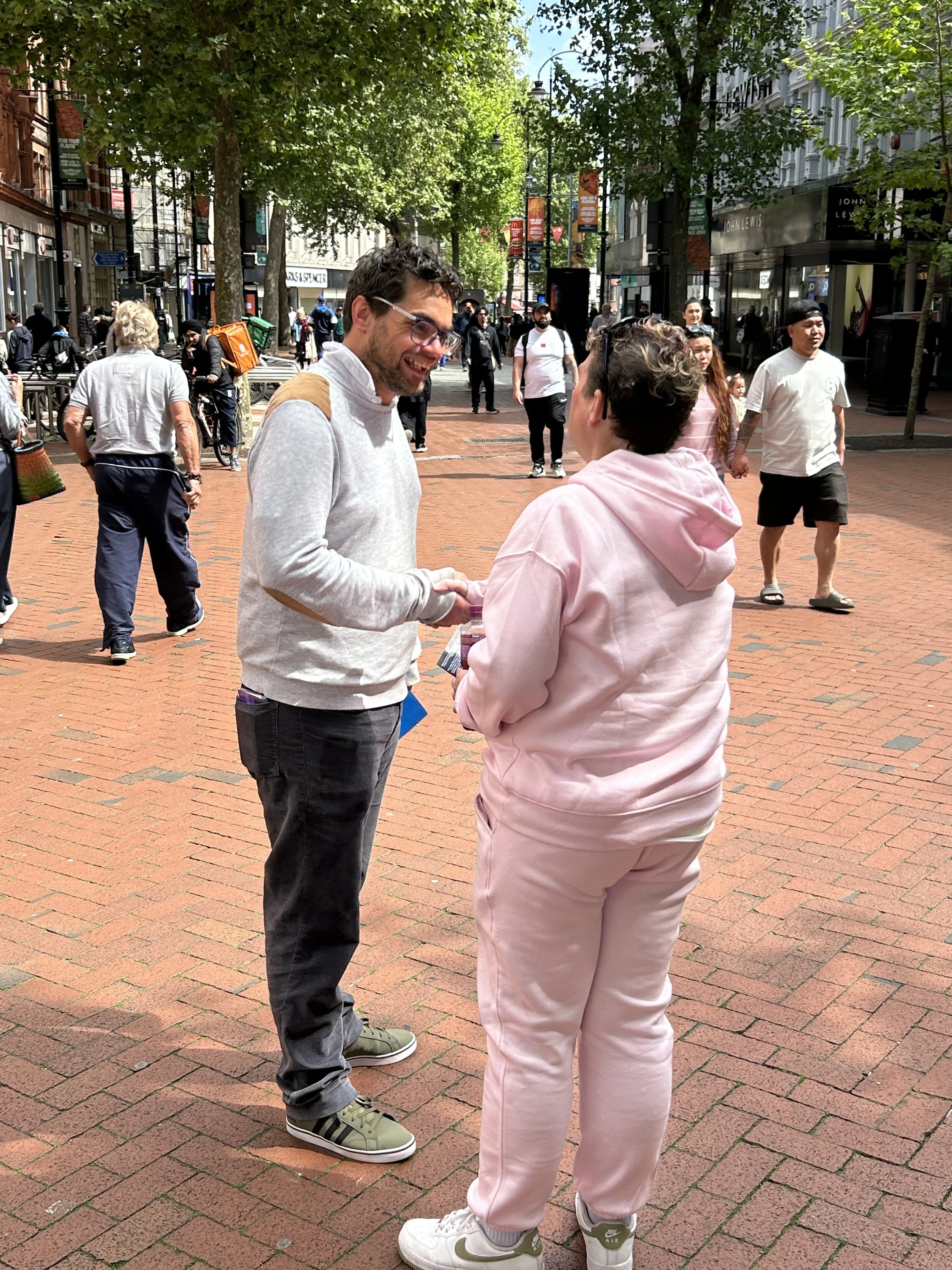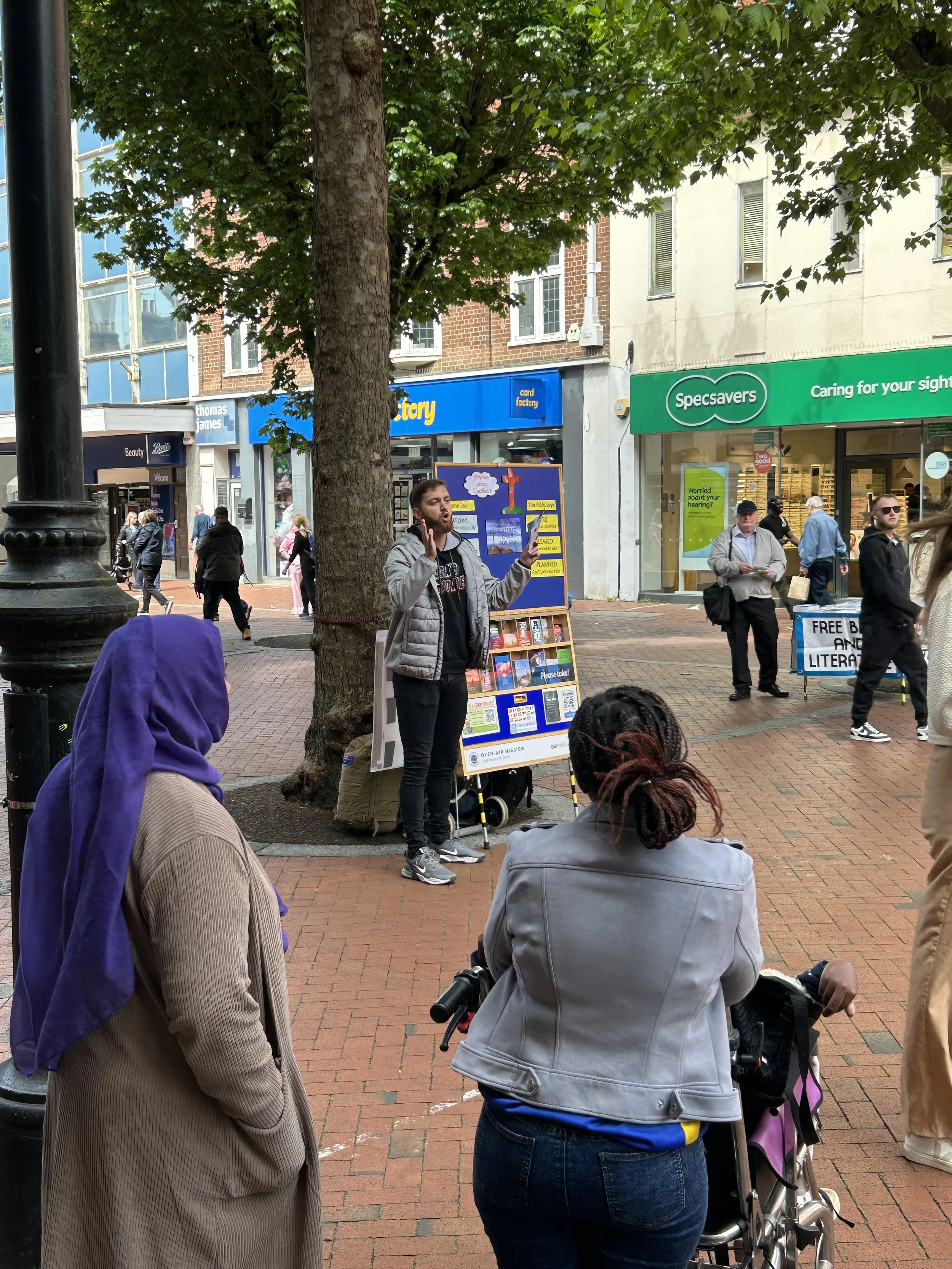 The Lord blessed us with a beautiful day in Reading; the sun was shining, and people were out and about in the town centre. After setting everything up, we prayed as a team and then began engaging people with the good news. The literature table quickly attracted attention, and tracts were being handed out. All around, team members were speaking to people about Jesus.