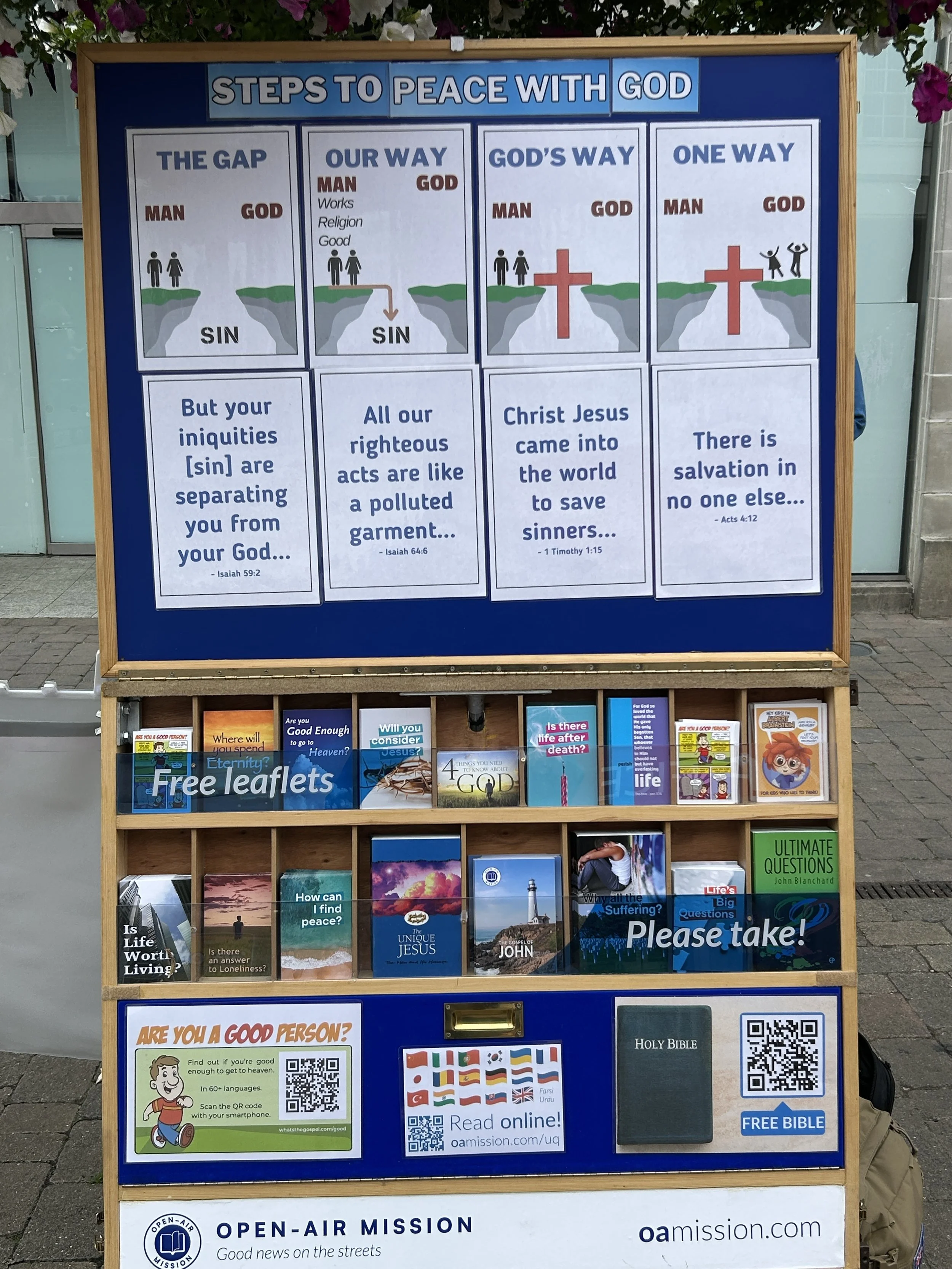 The preaching commenced when I spoke on “Steps to Peace with God.” One lady who listened spoke to Sue afterwards. She had been impacted by the message and wanted to find out more. She took a Gospel of John and was pointed towards a local church.