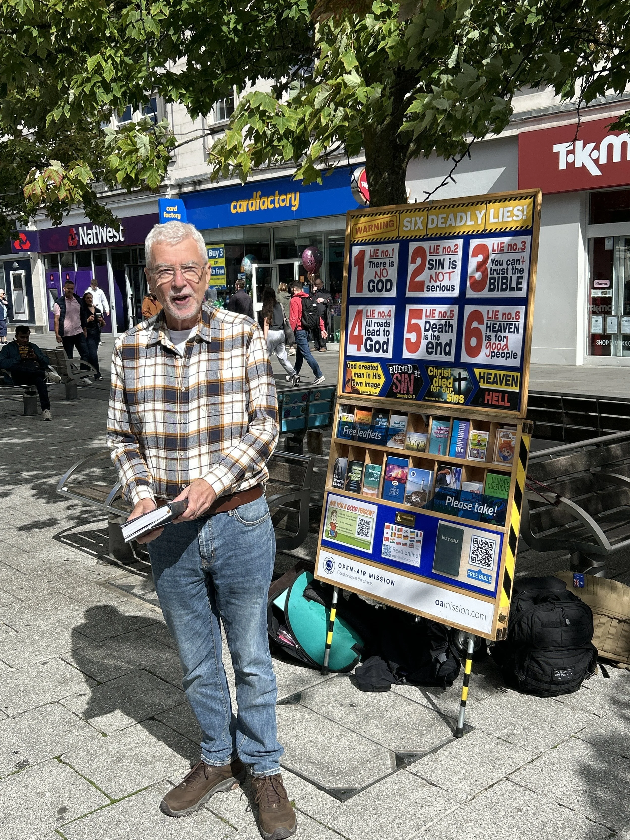 The final preacher of the day was Richard, who spoke on “Life: What’s the Point?” I wasn’t able to hear his message, as a man who had listened to me preach came over to talk. He told me he had grown up in a rough environment and had been deeply hurt by the Church. He shared his painful story, explaining that the ‘so-called Christians’ he had met seemed to think they were better than him. I told him that Christians are simply forgiven sinners, and that by nature we are no better than anyone else. He continued to share his concerns, and I was able to respond. In the end, he accepted a tract and a booklet addressing the question of why there is suffering.