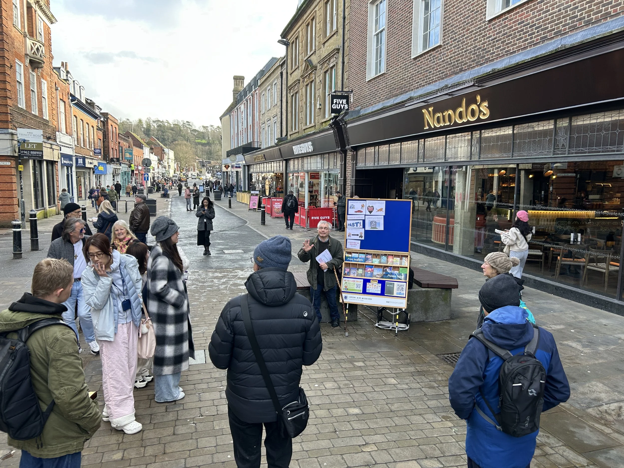 It has been a very wet start to the year. Each day we’ve had rain, which meant we were wondering whether our Winchester outreach would even take place. Thankfully, there was a break in the weather for the entire time we were on the streets. Drizzle before, rain afterwards — but in the middle it was windy, yet dry.
