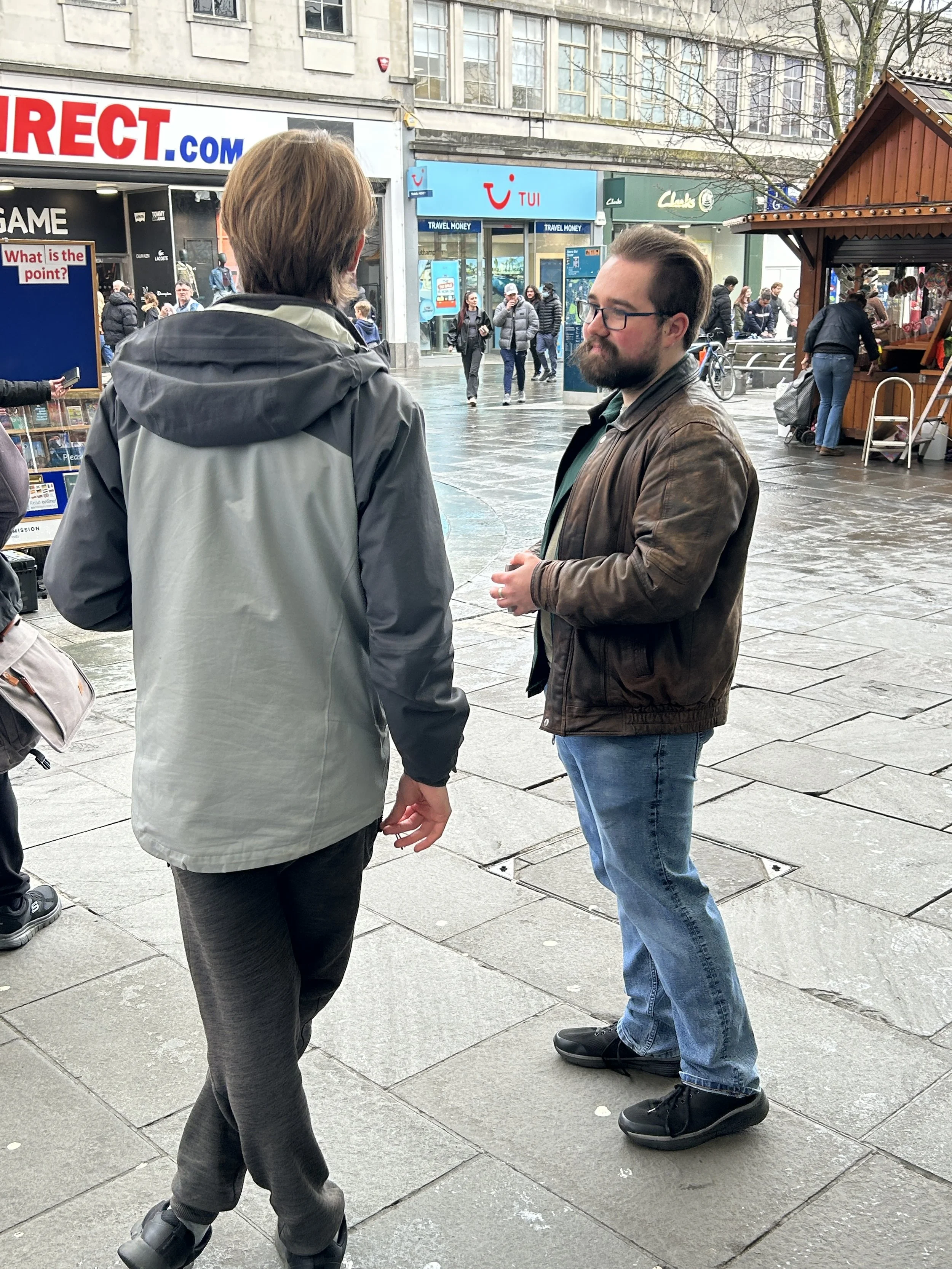 Due to the weather, we were only able to set up the open-air board and our ‘Free Bible’ box. Still, there was good engagement throughout the day. Indeed, today was one of the liveliest days we’ve had in some time.