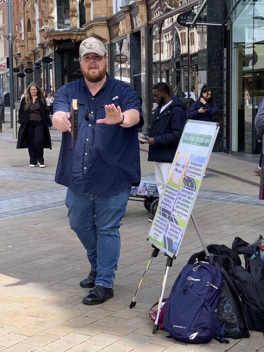 I was the first preacher of the day. Normally, we would use the full-size open-air board, but due to restrictions from the local council, we had to use a smaller board to fit within their guidelines. This made things a little more challenging, but we were still able to use visuals to help reinforce the gospel message. My open-air talk was on ‘The Road to Heaven’. In this message, I use several verses to explain sin, hell, and the gospel. It is a simple, though I hope clear, message.