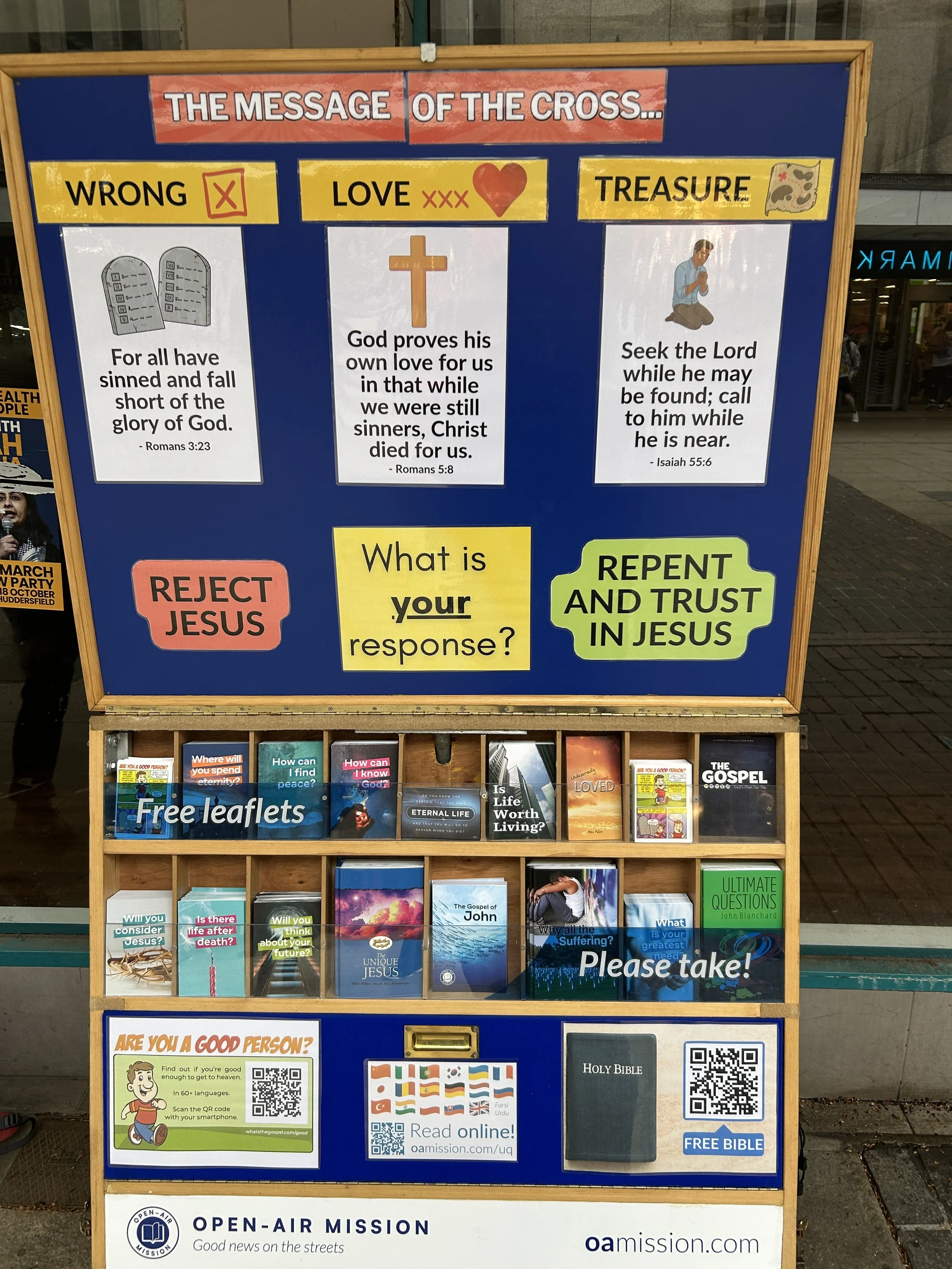 Day two of The Open-Air Mission Yorkshire team event had us heading up the road to Huddersfield. This location is much quieter than Leeds and also lower on a socio-economic scale. That being said, it turned out to be a good place to speak with people about the Lord Jesus.