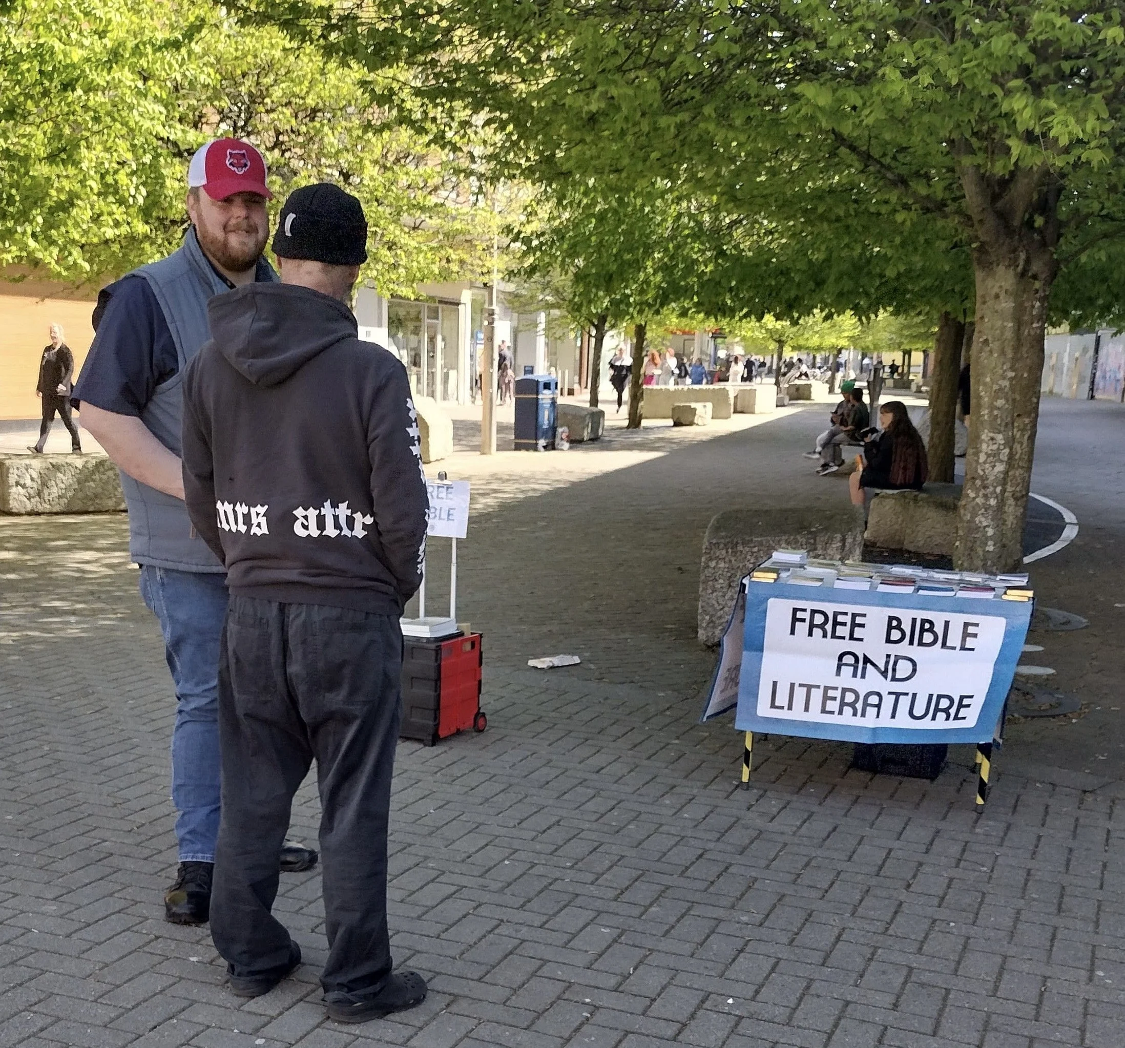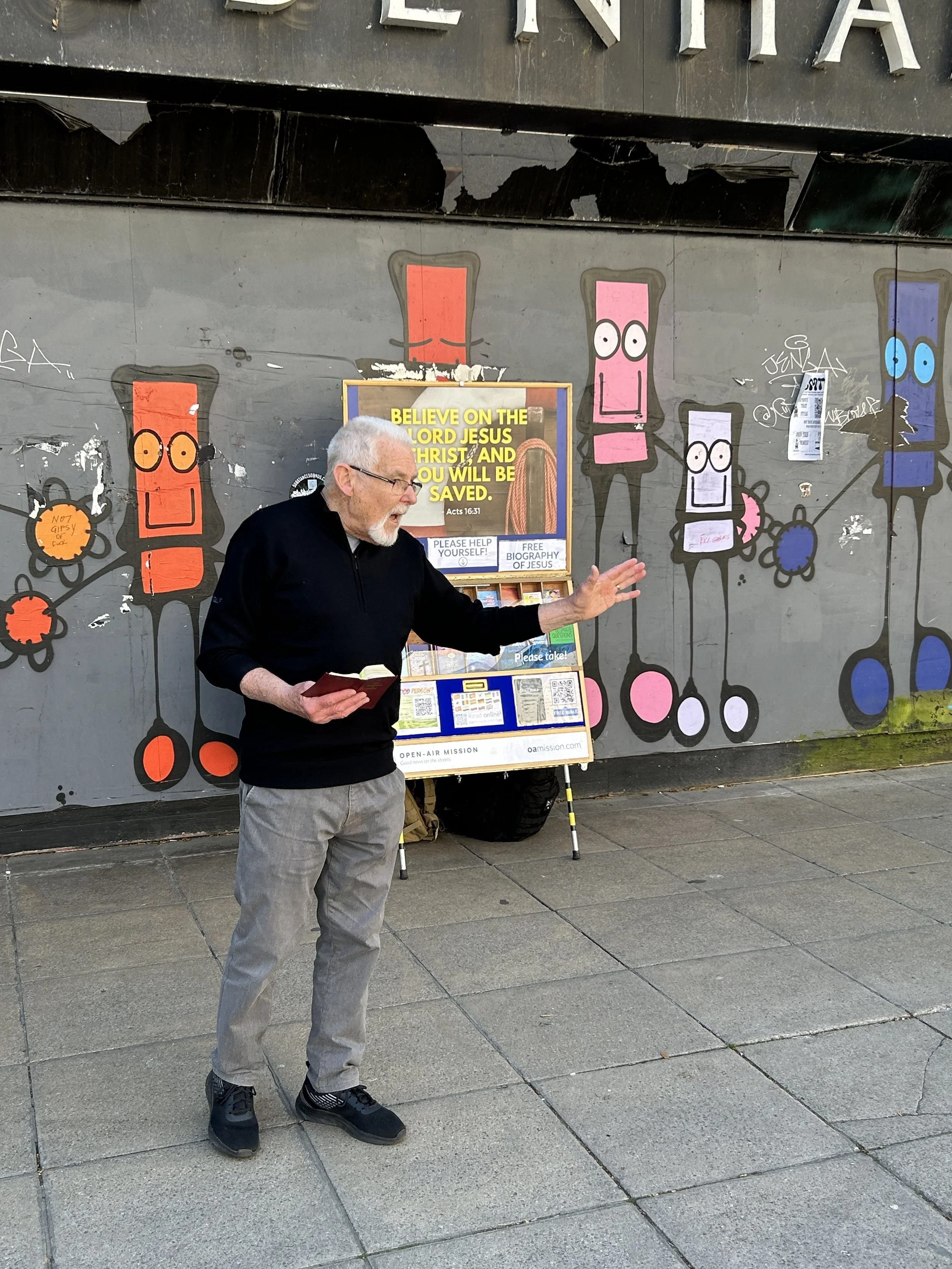 As Jim spoke, several people paused to listen. One lady, who was rushing for her train, was intrigued by the message, so she took a copy of the New Testament to read on her journey home. An older lady who listened told me she was content with God as she prays in the Anglican Cathedral – she did take a tract. Then, an old man walked past shouting, “Praise the Devil!”