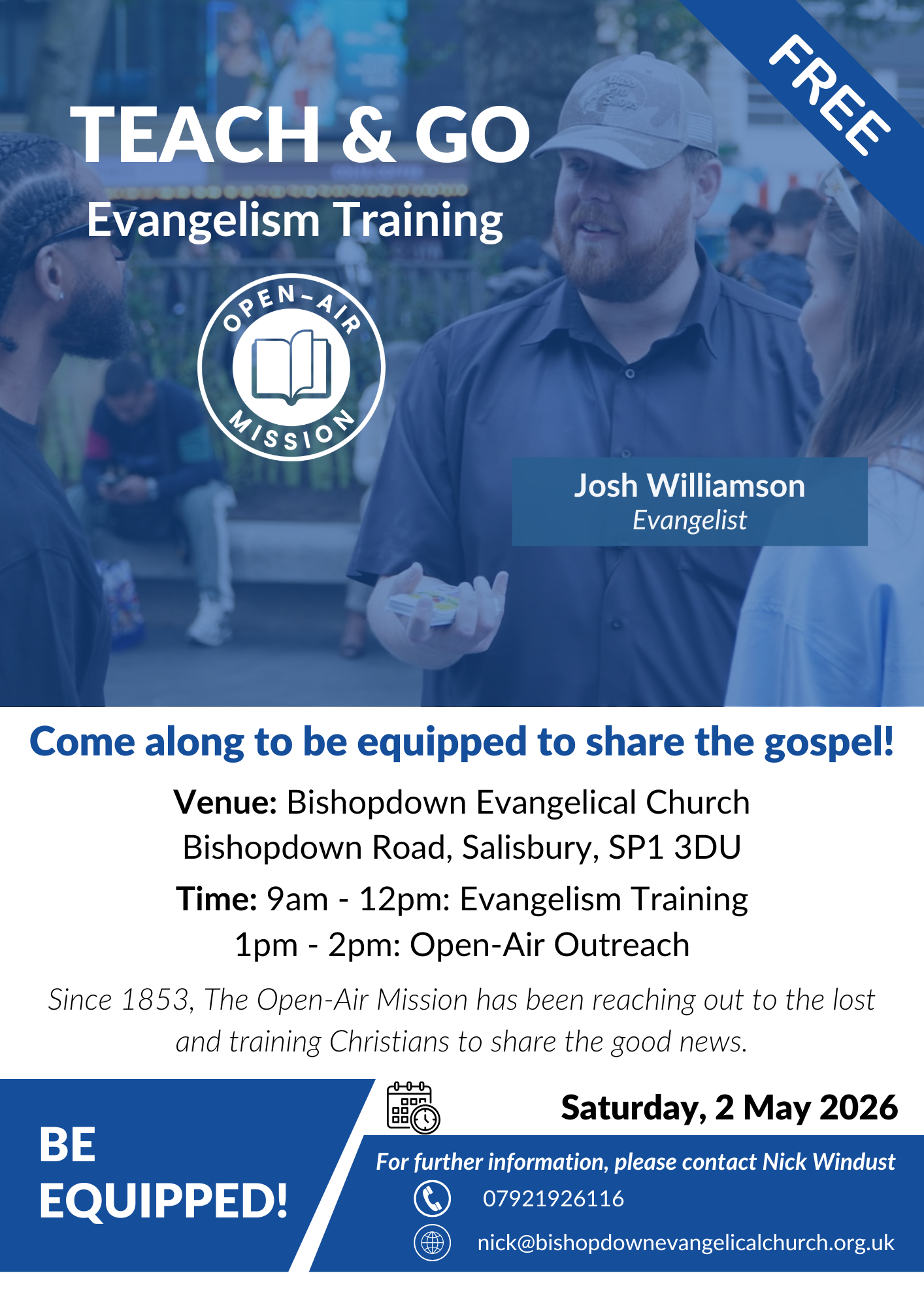 Back to All Events Teach and Go - Evangelism Training Saturday, May 2, 2026 9:00 AM 2:00 PM Bishopdown Evangelical Church Bishopdown Road Salisbury, England, SP1 3DU United Kingdom (map) Google Calendar ICS